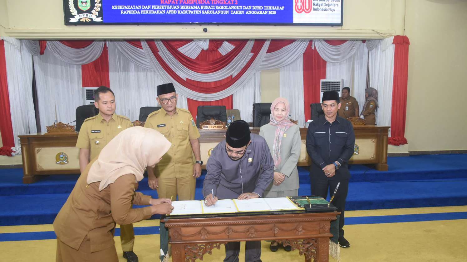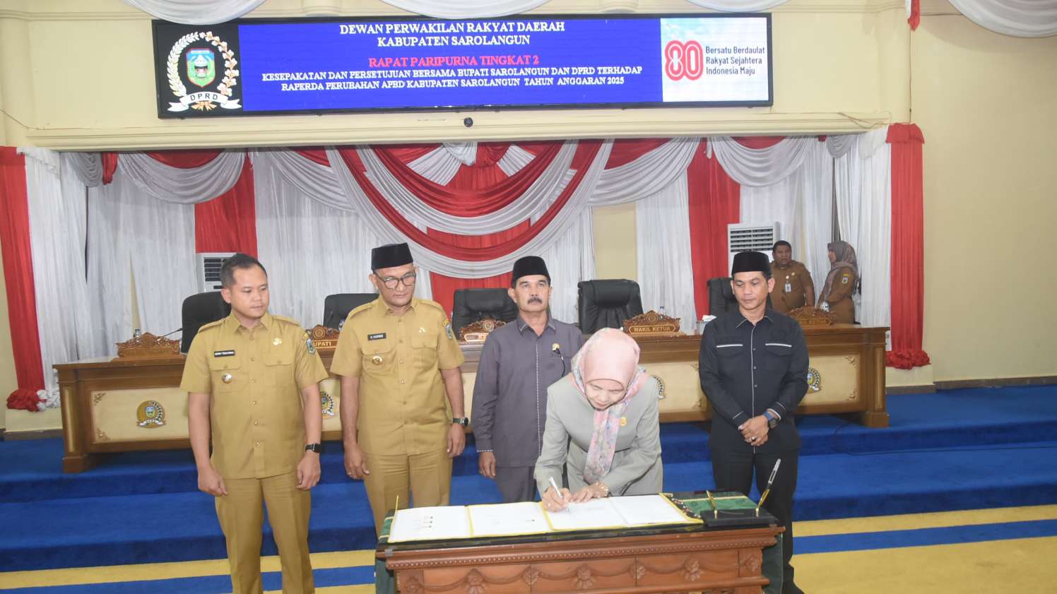 Akhirnya DPRD Sarolangun bersama Bupati Sarolangun menyetujui Ranperda menjadi Perda P-APBD Kabupaten Sarolangun tahun anggaran 2025.