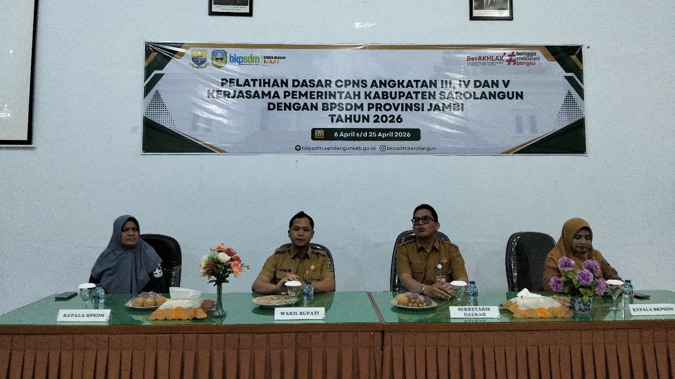 KABAR SAROLANGUN – Badan Kepegawaian dan Pengembangan Sumber Daya Manusia (BKPSDM) Kabupaten Sarolangun menggelar kegiatan Pelatihan Dasar (Latsar) Calon Pegawai Negeri Sipil (CPNS) Golongan III Formasi Umum angkatan III, IV dan V kerjasama Pemerintah Kabupaten Sarolangun dengan Badan Pengembang Sumber Daya Manusia (BPSDM) Provinsi Jambi Tahun 2026, Senin (06/04/2026) di gedung Diklat BKPSDM Sarolangun.