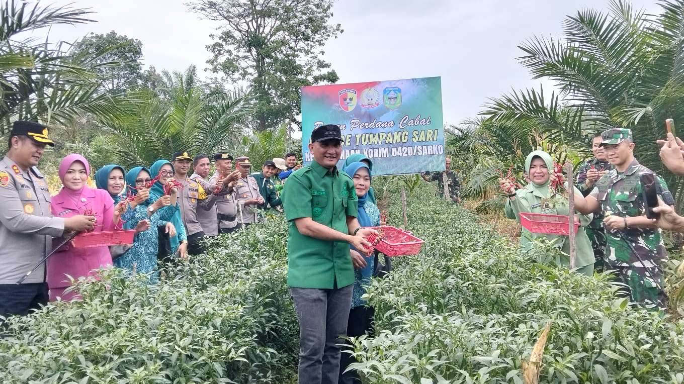KABAR SAROLANGUN – Bupati Sarolangun H Hurmin bersama jajaran Forkopimda Kabupaten Sarolangun dan kelompok tani Titian tinggi melakukan kegiatan panen cabe merah dan jagung di atas lahan yang dikelola kelompok tani dengan metode tumpang sari di perkebunan sawit, Sabtu (17/01/2026) di perkebunan milik Suhardin, Desa Rantau Tenang, Kecamatan Pelawan.