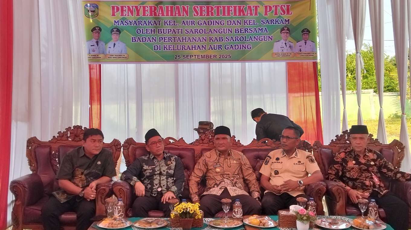 KABAR SAROLANGUN – Bupati Sarolangun H Hurmin menghadiri sekaligus menyerahkan sertifikat tanah Program Pendaftaran Tanah Sistematis Lengkap (PTSL) bagi masyarakat Kelurahan Aur Gading dan Kelurahan Sarolangun Kembang (Sarkam) bersama BPN Sarolangun, Kamis (25/09/2025) sore di halaman Kantor Kelurahan Aur Gading, Kecamatan Sarolangun.