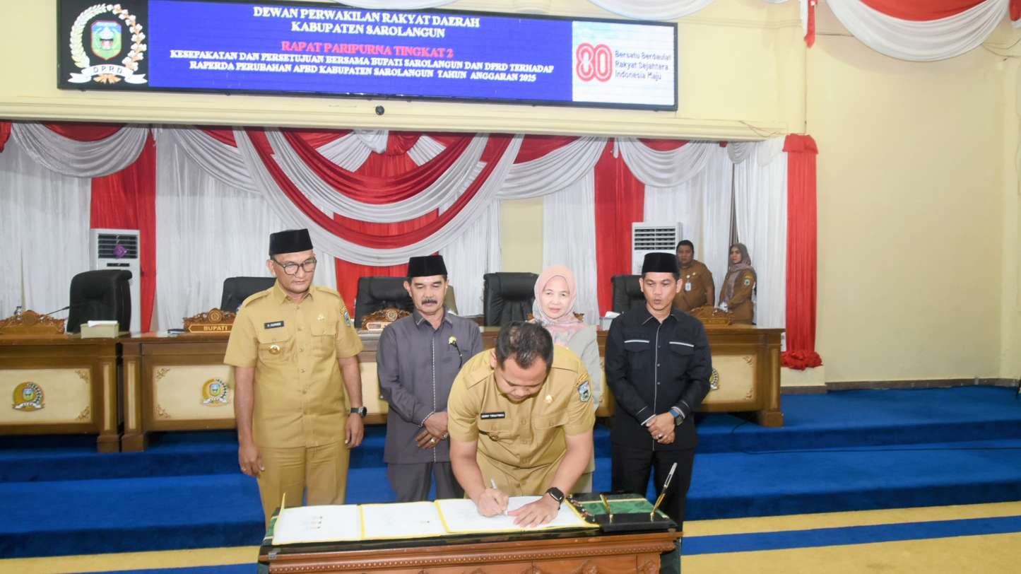Dalam rapat paripurna tersebut, Bupati Sarolangun Hurmin bersama Wakil Bupati Sarolangun Gerry Trisatwika menandatangani kesepakatan bersama Pimpinan DPRD Sarolangun dalam pengesahan Perda Perubahan APBD Kabupaten Sarolangun tahun anggaran 2025.