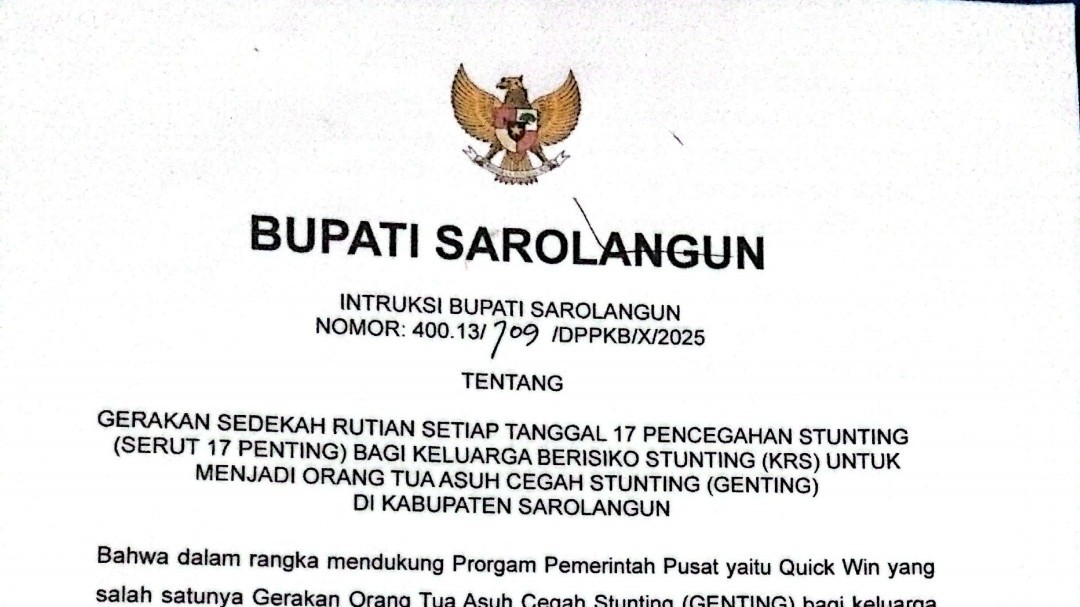 Sebagaimana dalam Instruksi Bupati Sarolangun nomor : 400.13/709/DPPKB/X/2025 tanggal 13 Oktober 2025, tentang Gerakan Sedekah Rutian Setiap tanggal 17 Pencegahan Stunting (SERUT 17 PENTING) bagi Keluarga Beresiko Stunting (KRS) untuk menjadi Orang Tua Asuh Cegah Stunting (GENTING) Kabupaten Sarolangun.