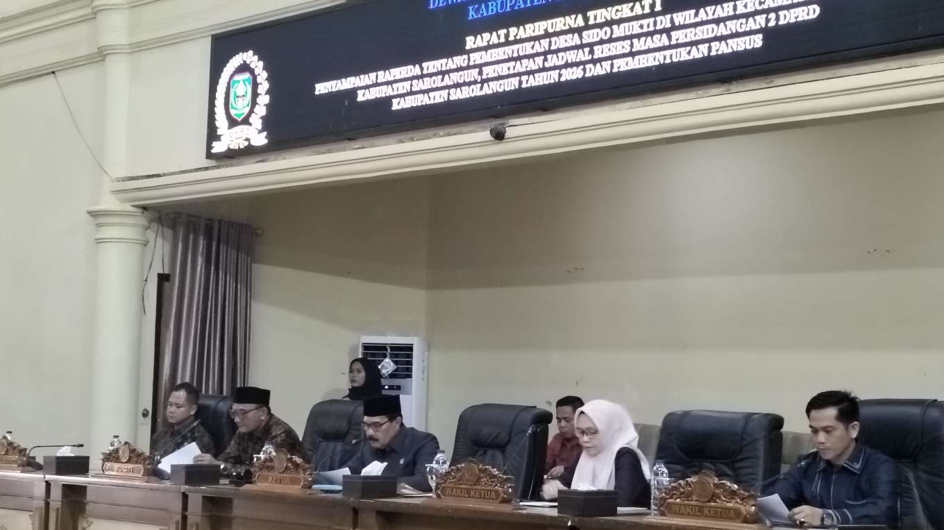 KABAR SAROLANGUN – DPRD Kabupaten Sarolangun menggelar kegiatan Rapat Paripurna Tingkat I dengan agenda Penyampaian Raperda Tentang Pembentukan Desa Sido Mukti Di Wilayah Kecamatan Singkut Kabupaten Sarolangun, Kamis (05/02/2026) di Gedung DPRD Sarolangun.
