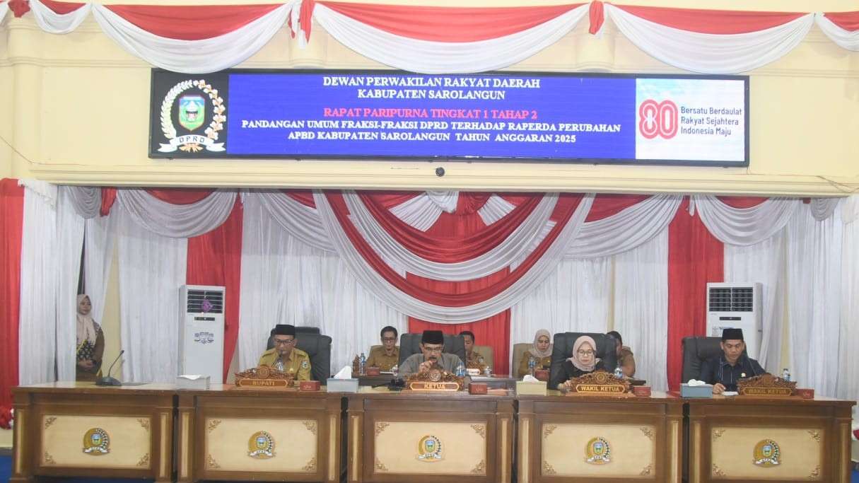 KABAR SAROLANGUN – DPRD Kabupaten Sarolangun menggelar rapat paripurna DPRD tingkat 1 tahap 2 dengan agenda penyampaian Pandangan Umum Fraksi DPRD Sarolangun Ranperda Perubahan APBD Kabupaten Sarolangun Tahun Anggaran 2025, Senin (11/08/2025) di gedung DPRD Kabupaten Sarolangun.