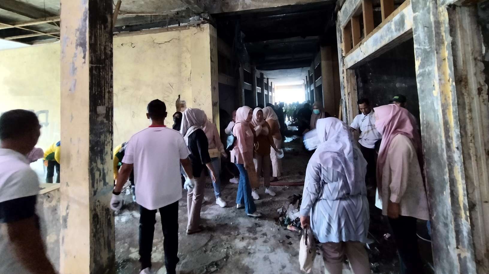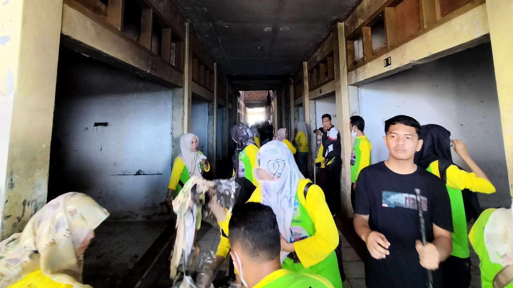 Tampak para peserta gotong royong berjibaku membersihkan gedung pasar bawah, yang selama ini tidak terawat dengan baik sehingga banyak sampah-sampah yang berserakan, kondisinya juga kumuh, kotor hingga berlumut.