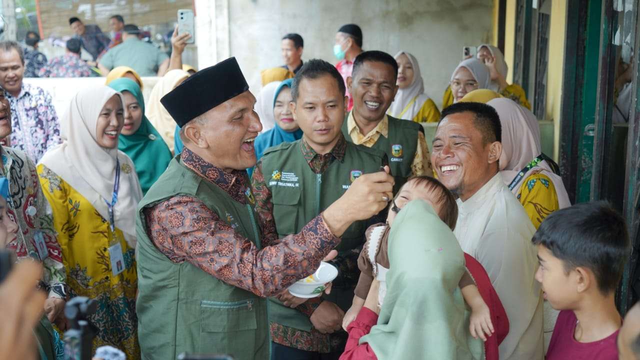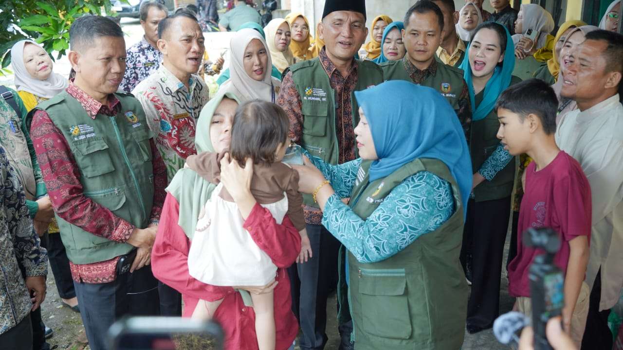 Di lokasi ini, Bupati Sarolangun Hurmin beserta ibu Ny Hj Risha Fitria dan jajaran menyerahkan bantuan pangan bergizi, kasur layak pakai, serta paket “Genting Berbakti Maju” dari program ASN SERUT 17, sambil secara simbolik menyuapi telur rebus dan memberikan susu kepada anak.