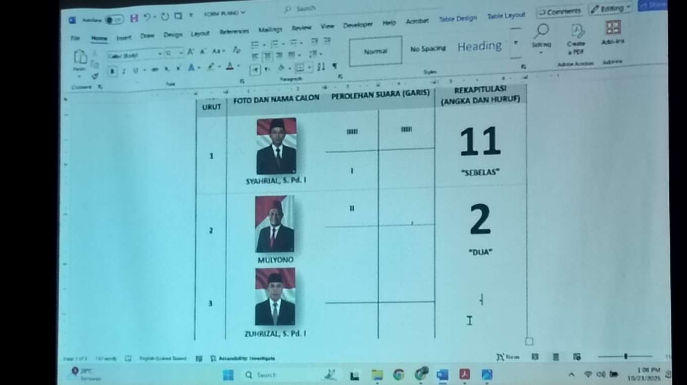 Usai dilakukan pemungutan suara, pimpinan sidang pleno kemudian melakukan penghitungan perolehan suara sehingga didapatkan perolehan suara, untuk Nomor Urut 01 Sahrial, S.Pd.I memperoleh jumlah 11 Suara, Nomor Urut 02 Mulyono memperoleh jumlah 2 suara sedangkan Nomor Urut 03 Zuhrizal, S.Pd.I memperoleh jumlah 0 suara.