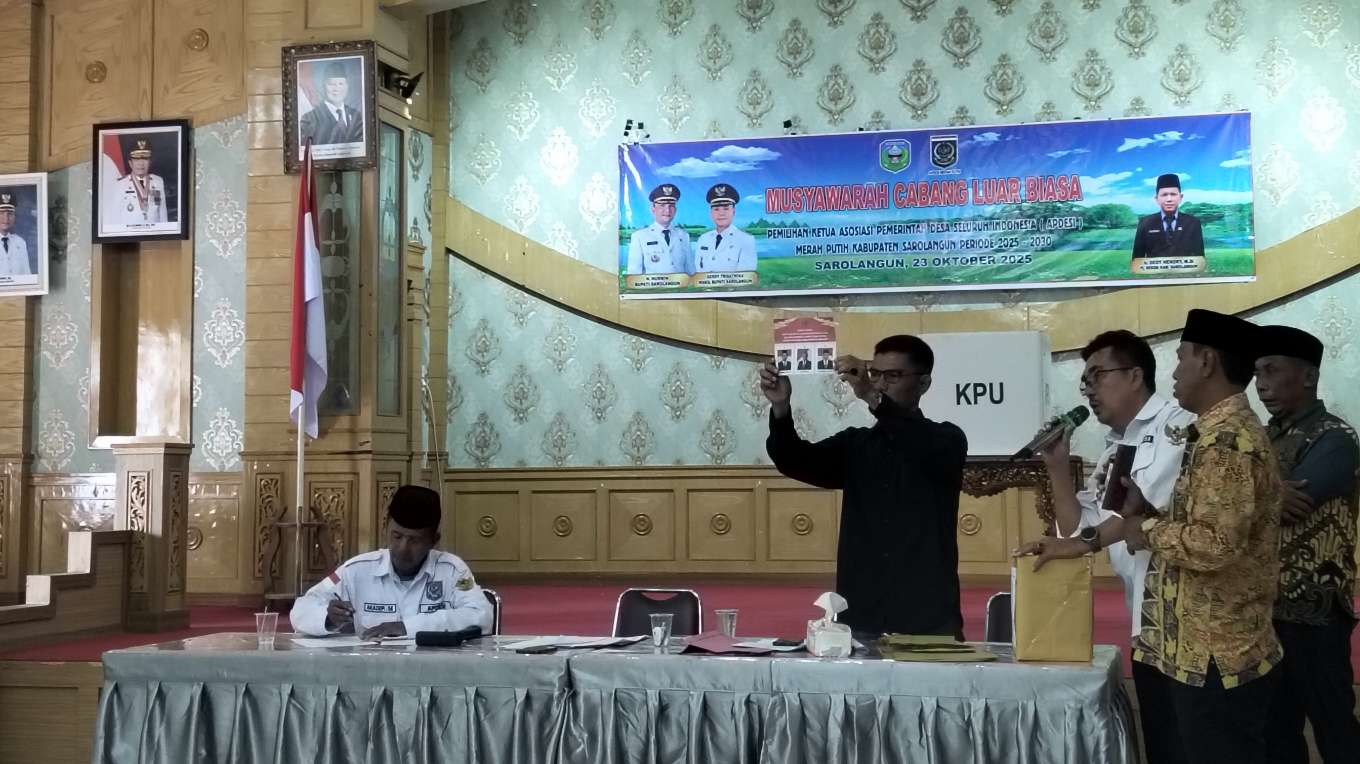 KABAR SAROLANGUN –Musyawarah Cabang Luas Biasa (Muscablub) dalam rangka Pemilihan Ketua Asosiasi Pemerintah Desa Seluruh Indonesia (APDESI) Merah Putih Kabupaten Sarolangun Priode 2025-2030 Tahun 2025, Kamis (23/10/2025) di ruang pola Kantor Bupati Sarolangun berlangsung sukses.