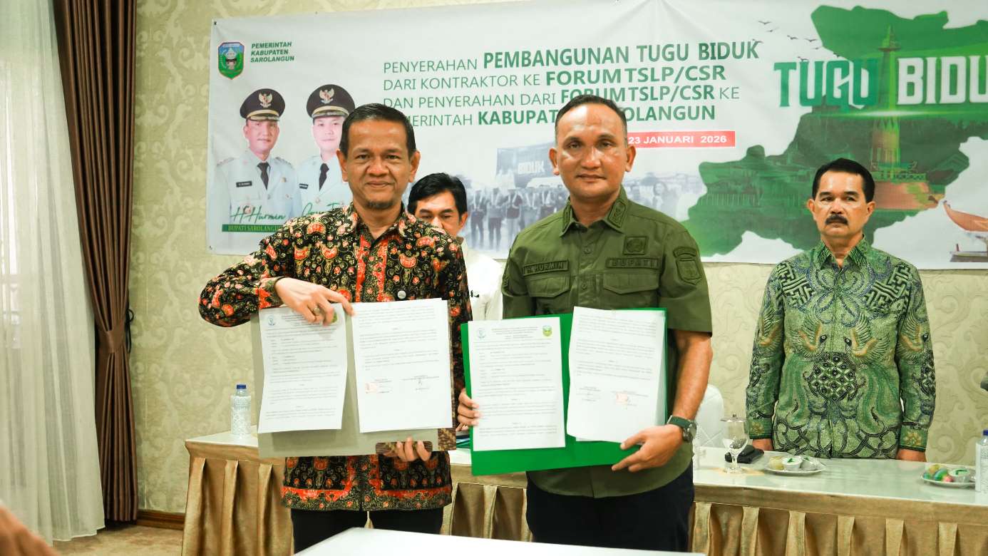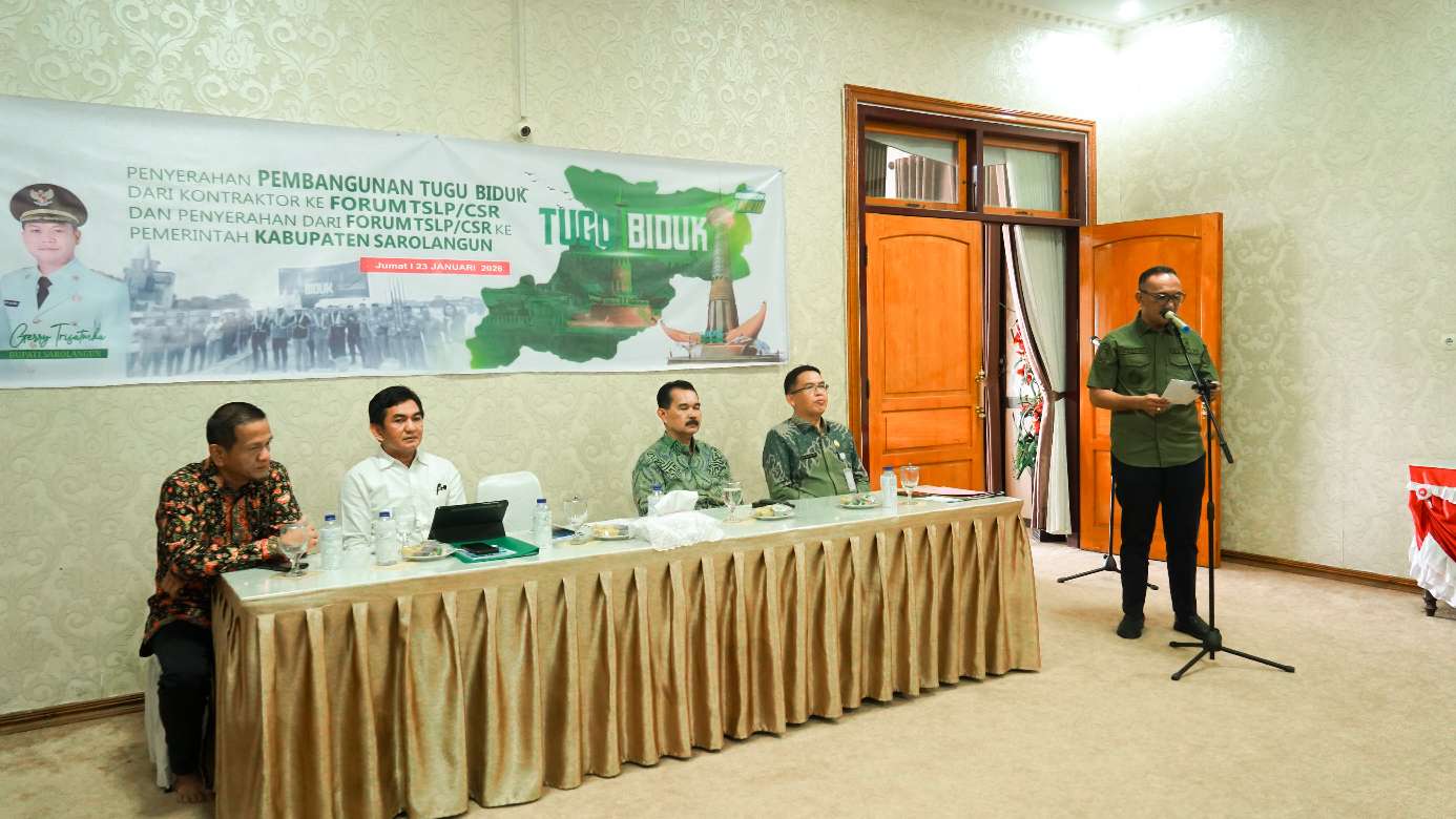 Serah terima aset tugu biduk ini diserahkan oleh kontraktor pelaksana PT Gentala Inspirasi Mahakarya Ar H Ibnu Ziyadi MZ, ST, MH, IAI, kepada Ketua Forum CSR Kabupaten Sarolangun M Ridwan, SE, dan kemudian diserahkan oleh Ketua forum CSR Kabupaten Sarolangun M Ridwan kepada Bupati Sarolangun H Hurmin, Jumat (23/01/2026) di Rumah Dinas Bupati Sarolangun.