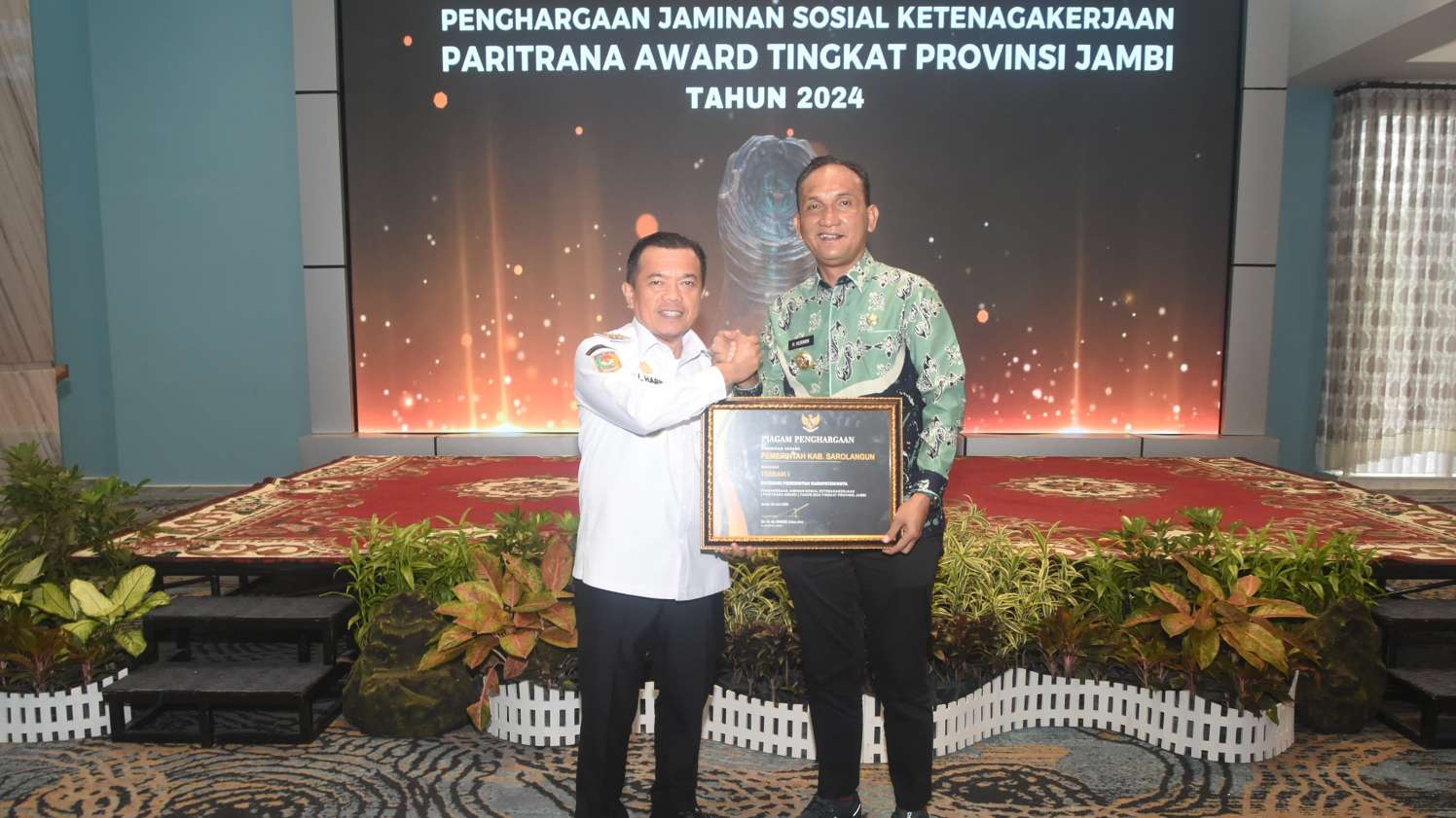 Bupati Sarolangun H Hurmin menerima penghargaan peringkat I Paritrana Awards Tahun 2024 tingkat provinsi Jambi yang diserahkan Gubernur Jambi Alharis