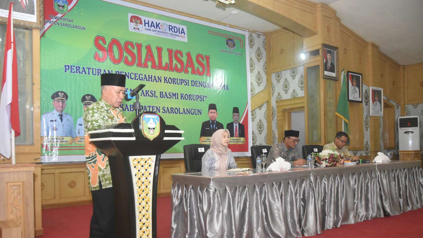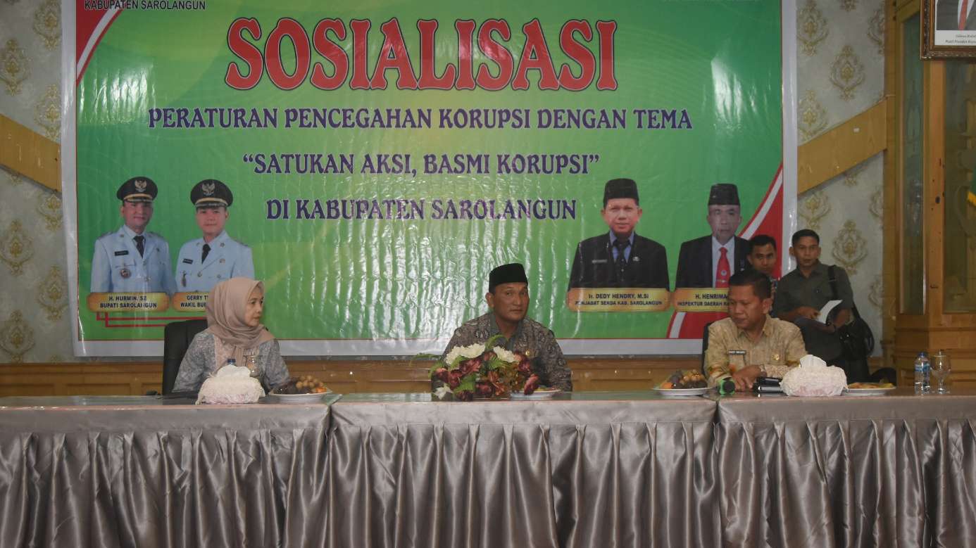 ” Dalam rangka mewujudkan visi dan misi Sarolangun Maju di lingkungan Pemerintah Kabupaten Sarolangun tentunya salah satunya bebas dari tindak pidana korupsi. Ada tiga cara dalam upaya pemberantasan korupsi, yakni Pencegahan terhadap tindakan korupsi, Pendidikan anti korupsi dan menanamkan nilai-nilai anti korupsi, ketiga penindakan terhadap prilaku tindak pidana korupsi,” katanya.
