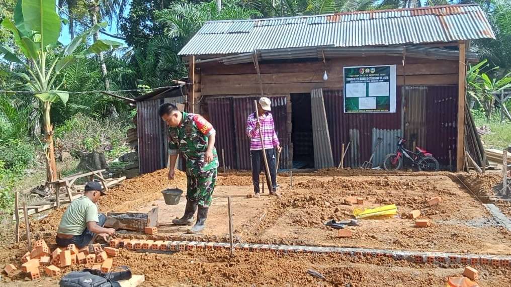Salah satu anggota Satgas TMMD, Kopda Tri Wibowo bersama masyarakat setempat bahu-membahu memasang pondasi untuk pembangunan Rumah Layak Huni milik Bapak Kiki.