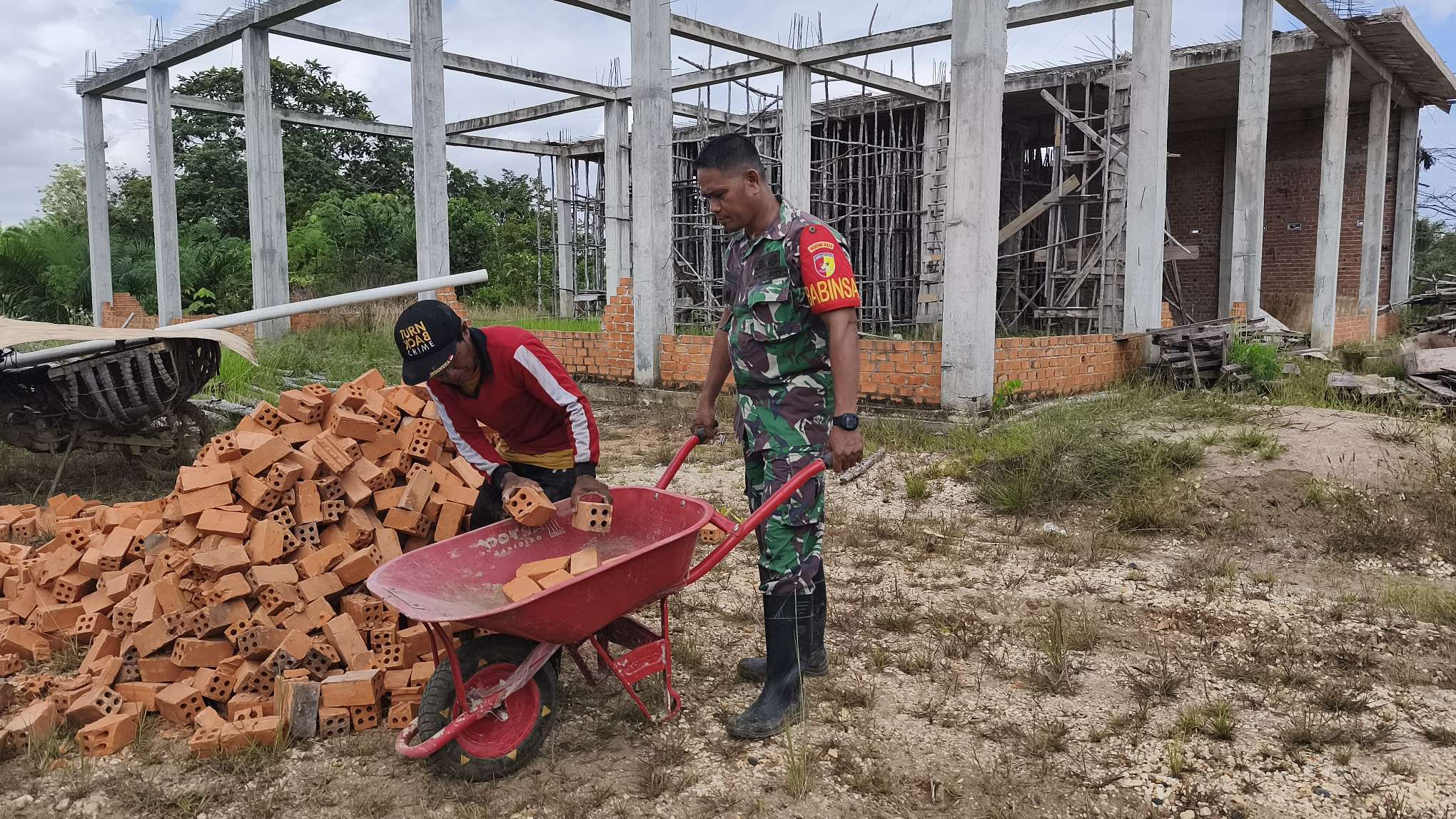 Kali ini, momen penuh semangat ditunjukkan oleh Serma Suwarno bersama warga Desa Seko Besar saat mengangkat batu bata untuk pembangunan MCK di Masjid Al-Kautsar, Kecamatan Pauh, Kabupaten Sarolangun.