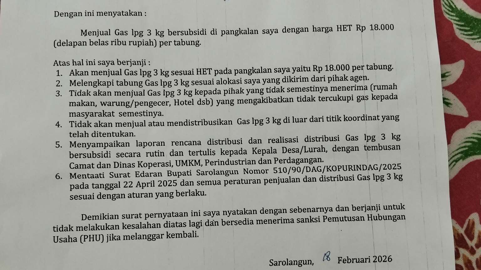 Poin utama dalam surat pernyataan itu, setiap pangkalan Menjual Gas lpg 3 kg bersubsidi di pangkalan saya dengan harga HET Rp 18.000 (delapan belas ribu rupiah) per tabung.