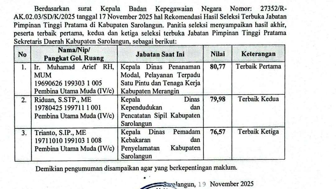 Berdasarkan Surat Kepala Badan Kepegawaian Negara Nomor: 27352/R-AK.02.03/SD/K/2025 tanggal 17 November 2025 perihal Rekomendasi Hasil Seleksi Terbuka Jabatan Pimpinan Tinggi Pratama di Kabupaten Sarolangun, Panitia Seleksi menyampaikan hasil akhir peserta terbaik pertama, kedua, dan ketiga Selter Jabatan Sekda Sarolangun.